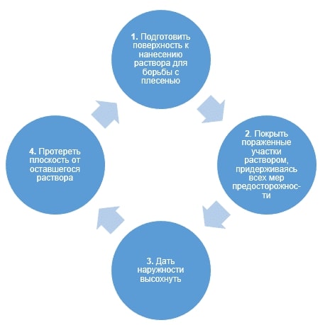 Сам процесс избавление от плесени на пораженных участках условно разделяется на несколько этапов, таких как: