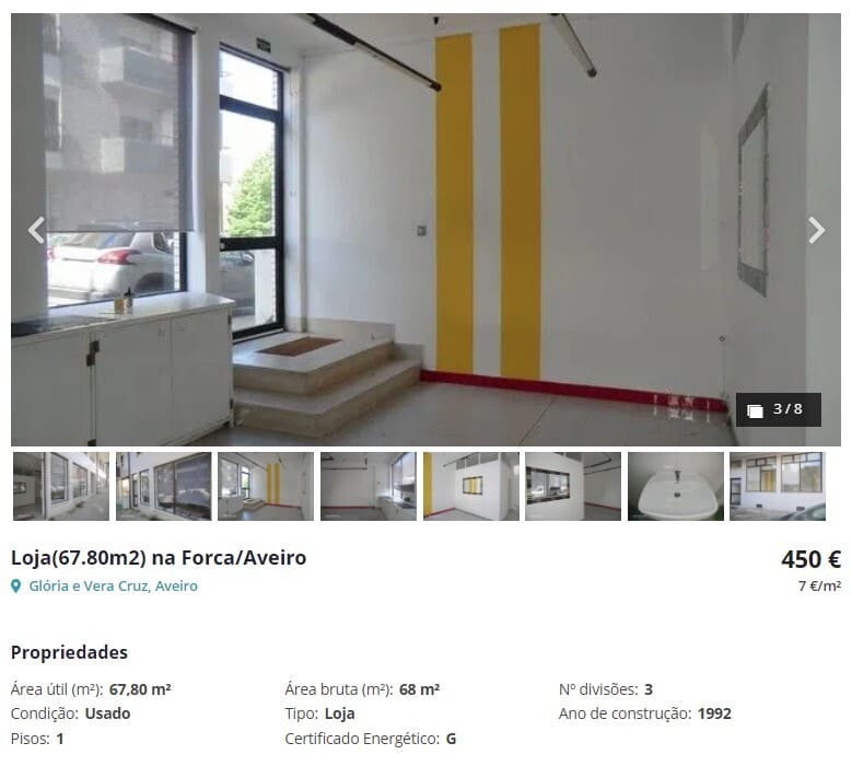 Давайте проверим сколько может составлять аренда коммерческого помещения в небольшом португальском городе, например, в Авейру.
