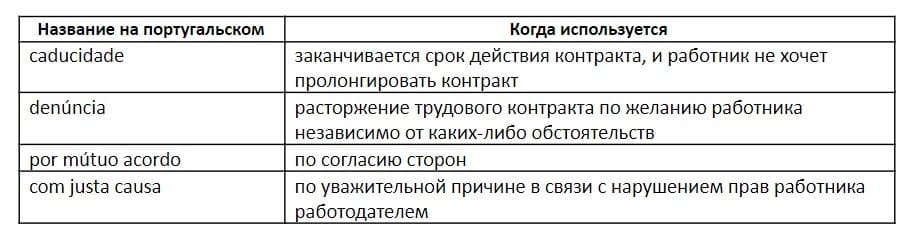 Прекращение действия контракта по причине “com justa causa” должно быть оформлено в письменной форме с кратким указанием фактов, которые оправдывают увольнение, в течение 30 дней после того, как стало известно о фактах. В некоторых условиях действуют другие условия процесса, более подробно можно почитать тут.