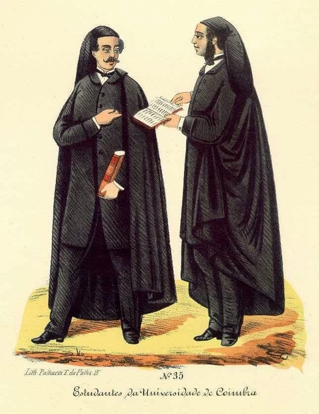 Академический костюм берет свое начало еще во времена клерикализма на территории Португалии. На протяжении существования этого политического течения, стремящегося к укреплению влияния церкви в государстве, появляются первые студенческие костюмы. Эти одеяния создавались по подобию ряс священнослужителей, имевших исключительное право изучать общие науки. Зачастую, академические костюмы были черного или коричневого цветов, ведь яркие окрасы никогда не допускались в богослужении. С распространением университетов и возможностью в них проходить обучение не только священниками, но и другими людьми, произошла естественная эволюция академического костюма. Использование “Плаща и рясы” (Capa e Batina) новыми студентами было обусловлено соблюдением Академического Кодекса и необходимостью обозначить принадлежность к тому или иному высшему учебному заведению страны. Так, с 1834 по 1910 год ношение академического одеяния было обязательным по периметру всего университета. Впрочем, с конца 1910 года было отменено обязательное ношение костюма и его использование стало добровольным.